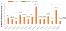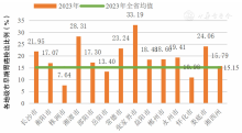 图3. 各地级市早期结直肠癌检出比例(各地级市柱状图上方标注的为该地级市的检出比例,而绿色横线代表湖南省的平均检出比例)