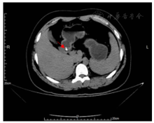 图1. 腹部CT提示胃窦区胃壁及胃腔内V形高密度影