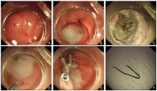 图3. 胃内异物经ESD取出的内镜过程注:A:胃窦前壁近幽门黏膜隆起,中央可见异物末端;B:黏膜下注射;C:黏膜切开刀剥离隆起表面黏膜其内可见异物;D:异物钳取出异物;E:止血夹夹闭创面;F:胃内异物